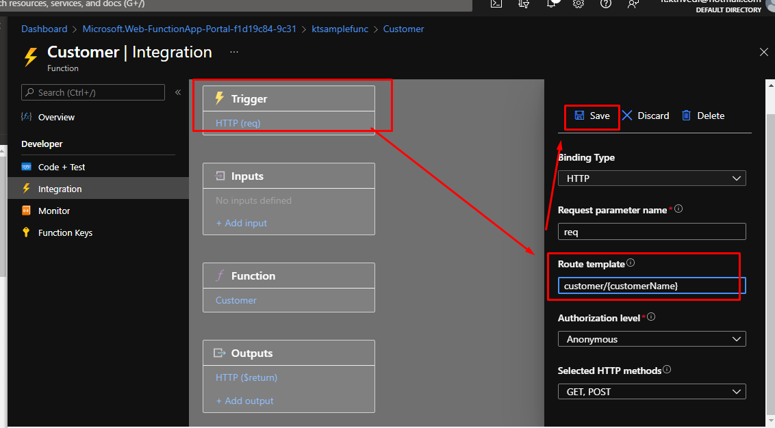 We are going to edit the trigger to do that. In the trigger, we will create a route template that will behave like a REST API.