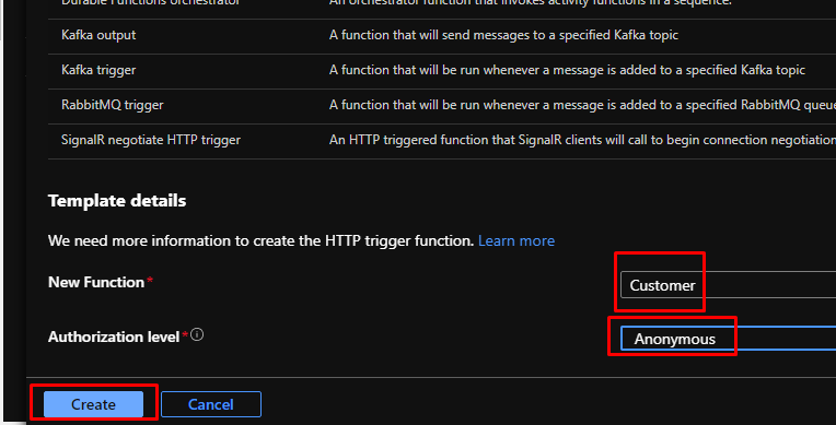 Next, give name Customer to the function and set the Authorization level as Anonymous.