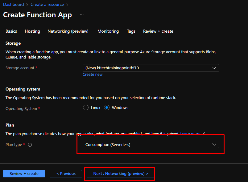 In the Hosting tab, you will see that we will be using the consumption plan that is serverless. Next go to networking and skip that tab.