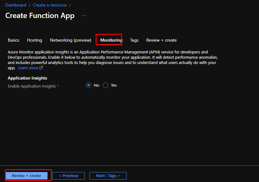 Next in monitoring, disable application insights and create the function app.
