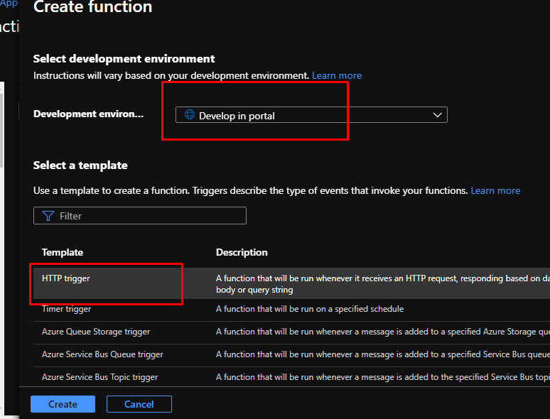 Choose the development environment as develop in portal. And for the template, choose HTTP trigger. Next, scroll down.
