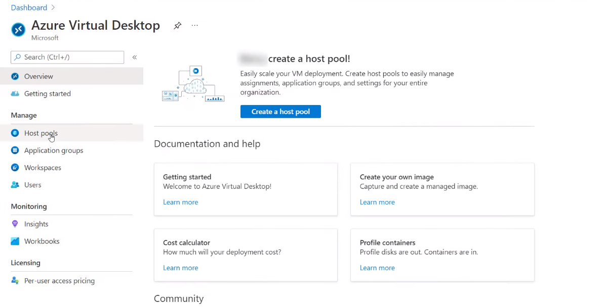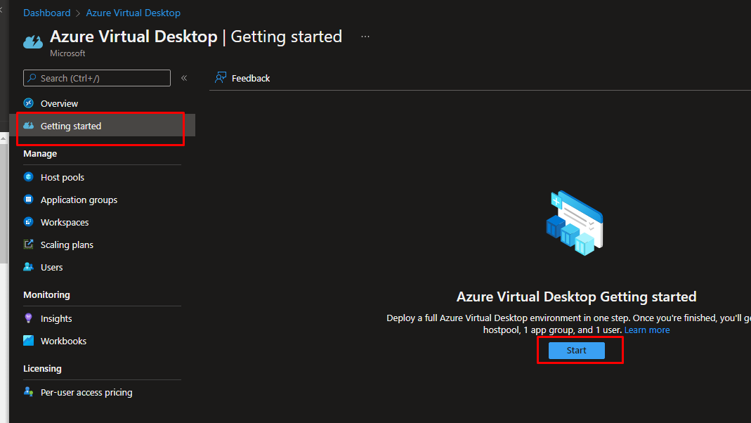 In the management blade, go to Getting Started and click start. From here, we are going to create a host pool with an application group and a user and session hosts which are VMs.