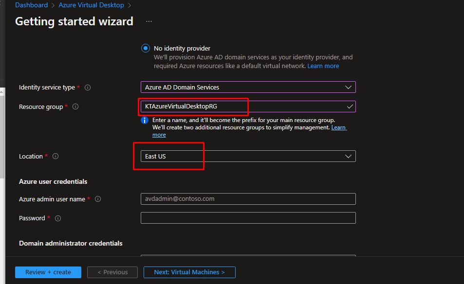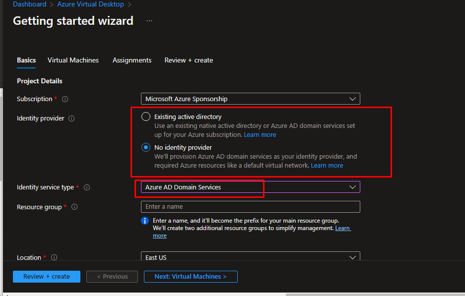 For the identity provider, choose no identity provider. For the identity service type, choose Azure AD Domain Services.
