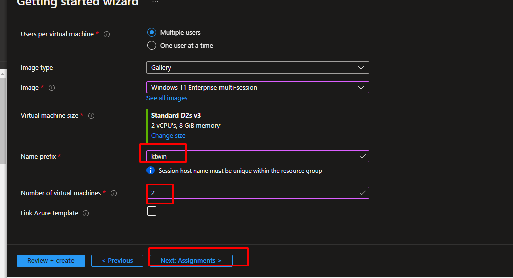 Add a name prefix and we are going to have 2 virtual machines. We are not going to link any Azure template as of now. Next, go to assignments.