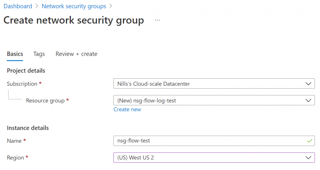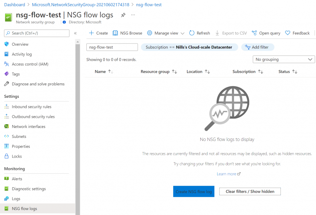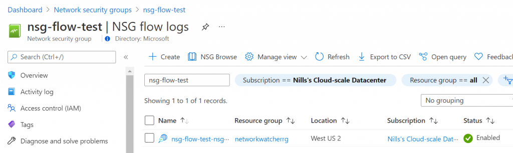 It then took a couple of seconds for the NSG to be created. When I checked it immediately after creation, the flow log wasn’t created: