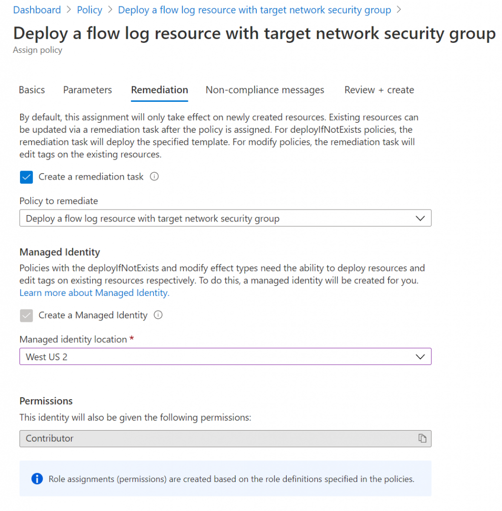 Next, you can optionally create a remediation task. A remediation task would give you the option to “fix” all non-compliant resources directly. This is optional, but I’m enabling it nonetheless.