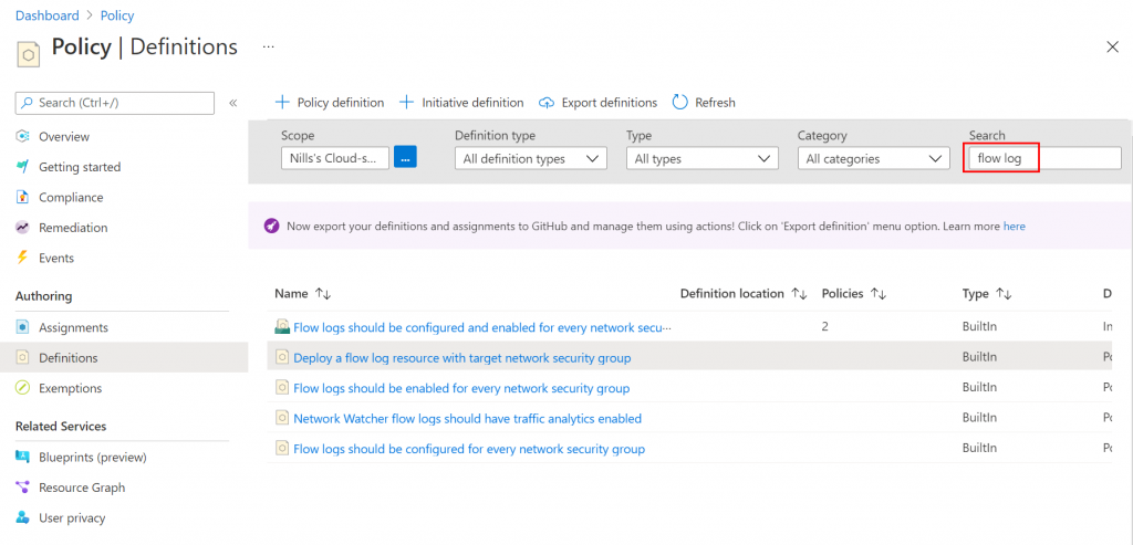 To start, open the policy definitions blade in the Azure portal. There you can look for the policies containing the “flow log” string.