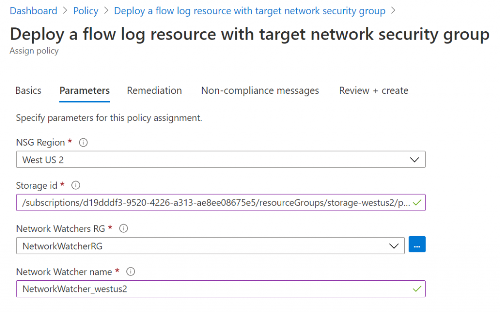 Next, you’ll need to provide the region, a storage account resource ID in that region, and the network watcher in that region. To get the storage account ID, open your storage account and go to endpoints to find your resource ID. For network watcher, open the network watcher service in the portal, and copy-paste the name of the resource in the right region. The resource group name should be NetworkWatcherRG. Now provide all those inputs for the policy creation: