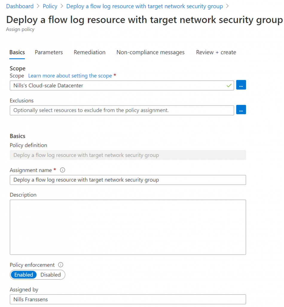Select the “Deploy a flow log resource with target network security group” policy and click the assign button. Next, you’ll have to configure the policy. First, provide it a scope (which in my case will be my full subscription).