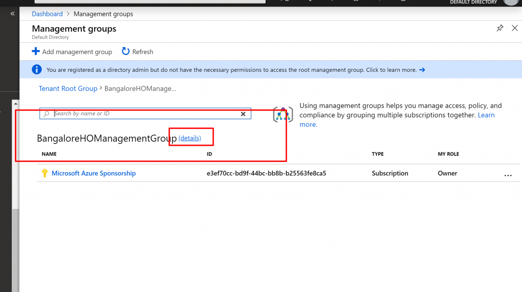 - Next, let us add RBAC to the management group. Select the Management Group and click on Details.