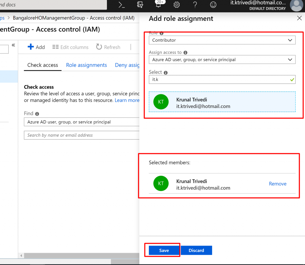 - Click on Access Control. Click Add –> Role Assignment. Select Contributor as a Role and select User or a Group. Then, click Save.