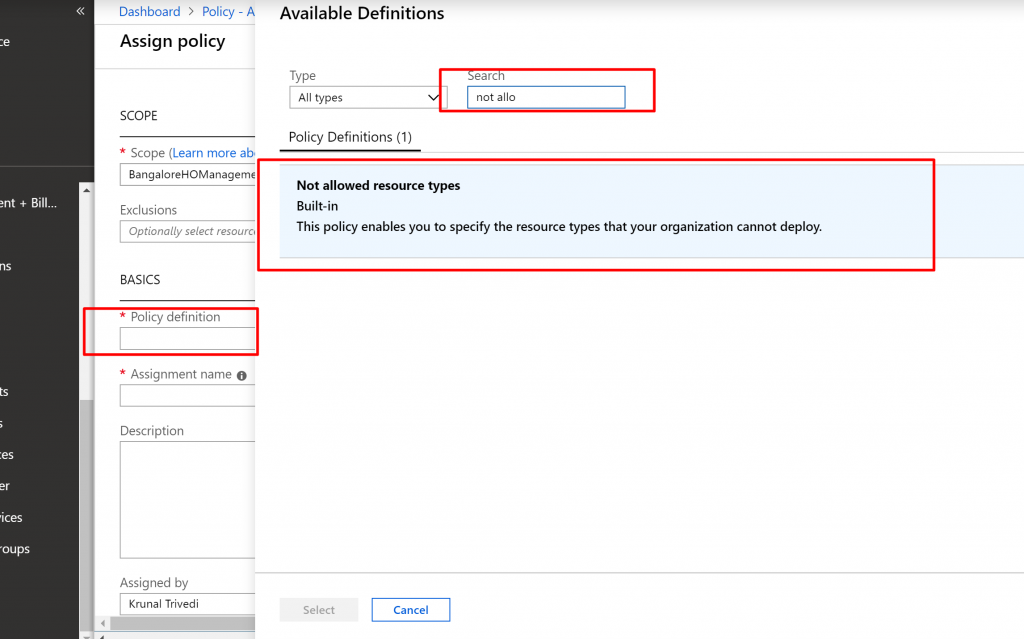 - Click on the ellipsis button for Policy Definition Box. Search for not-allowed and select Not Allowed Resource Types.