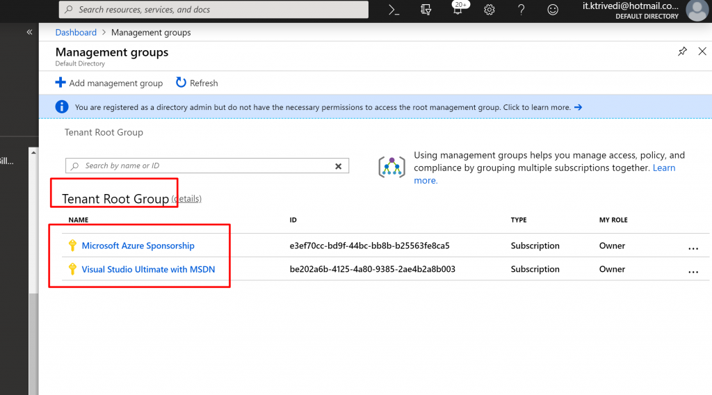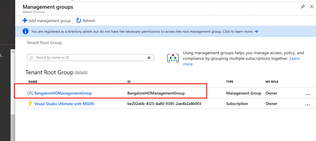 - Once you are inside Management Groups, you can see we have one default group available called Tenant Root Group. By default, all your subscriptions would be a part of this Tenant Root Group.