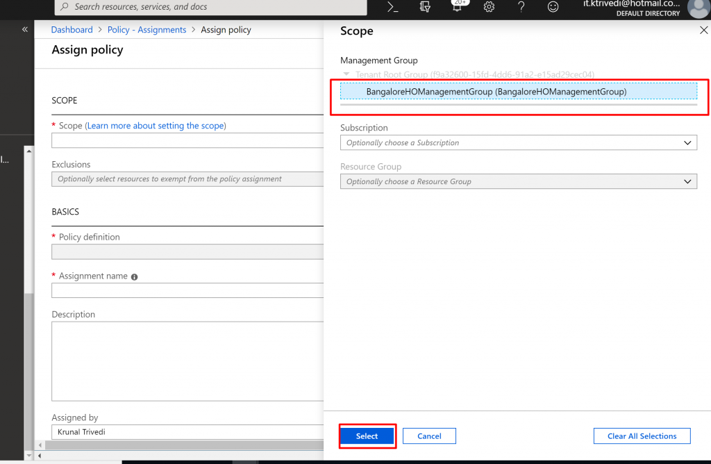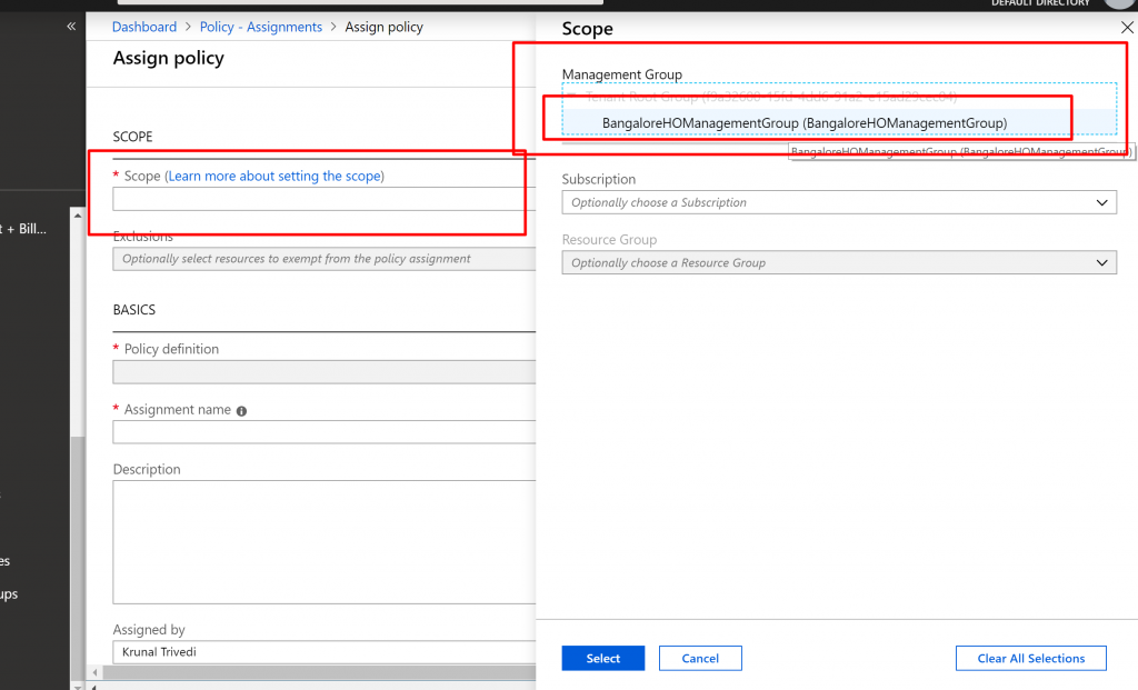 - In the Scope Box, instead of Subscription we are going to select Management Group Name.