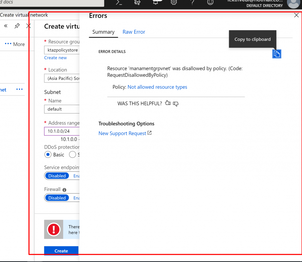- When we click create, you can see that we will get validation errors. If you click on the validation error, it will show you the summary mentioning ‘disallowed by the policy’.