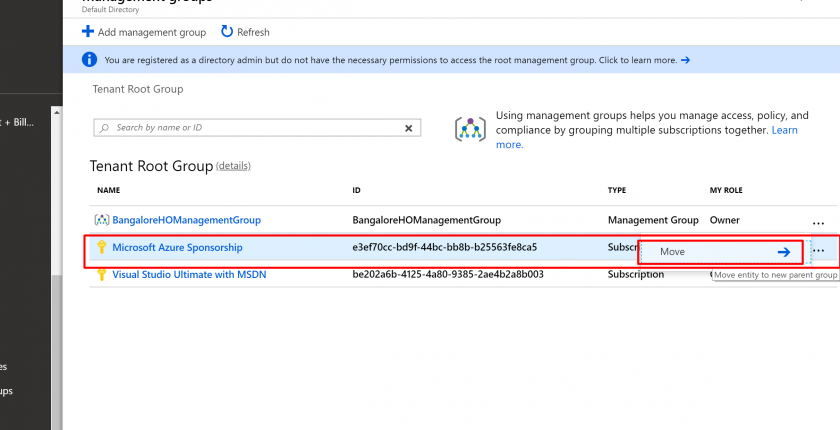 - You can see still your subscriptions are under Tenant Root Group and they are not inside the newly created Management Group. So, let us move our subscription to the newly created Management Group.