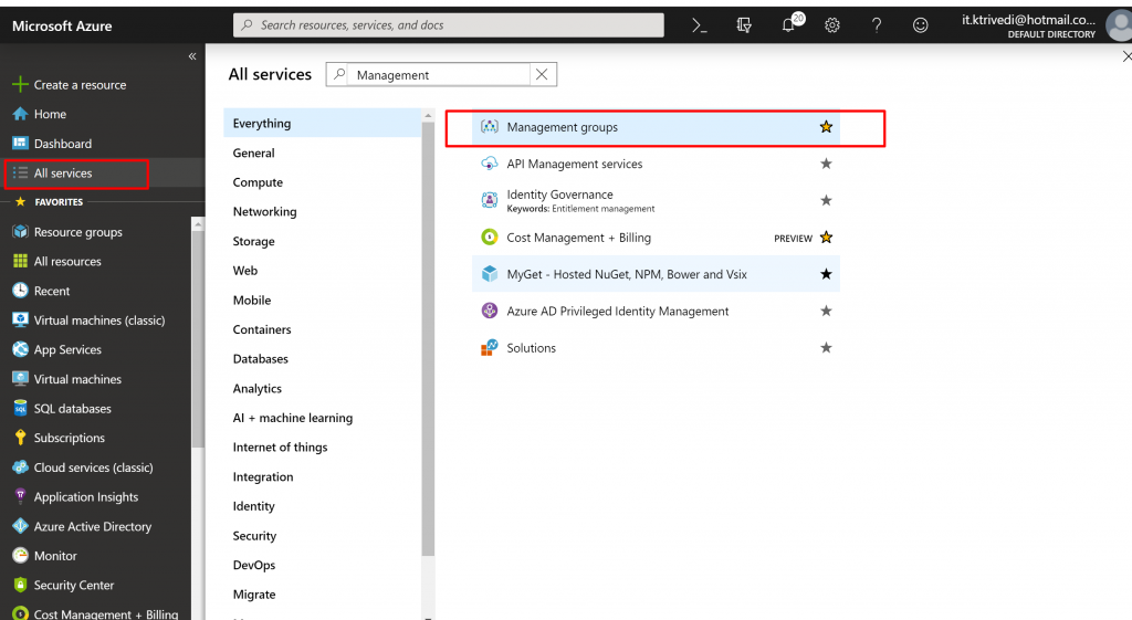 - Go to Azure Portal –> Click on All Services –> Search for Management Groups