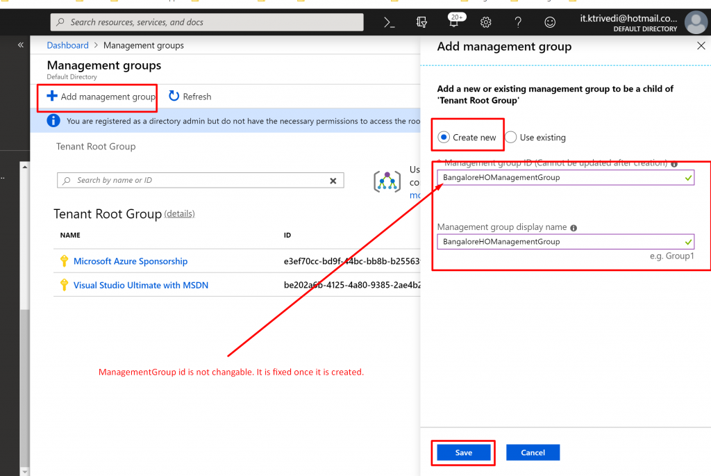 - Click Add Management Group and provide ID and Display Name. ID is not changeable; it is fixed.