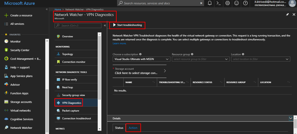 In the VPN Diagnostics blade, you can select the VPN gateways you want to troubleshoot and then click on start troubleshooting. Right now I don’t have any gateways in my subscription. Then you can go to the actions tab to see the report file.