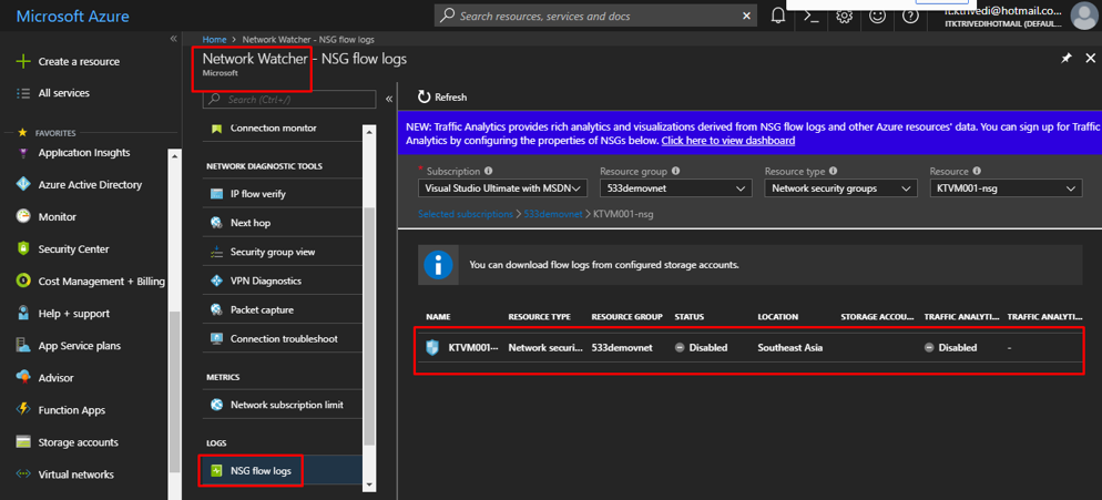 NSG flow logs give you a more detailed view of the logs. Currently it is disabled in my case. You can click on it and turn it on.