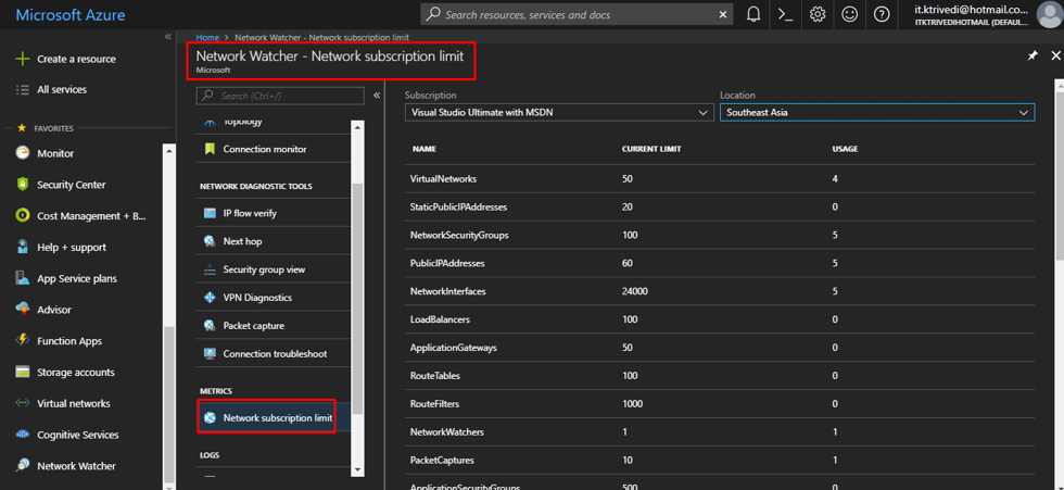 Here in the Network Subscription Limit, you can see current limit and usage of each resource by location.