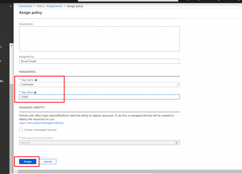 - Now here are going to specify tagName and tagValue. Name is CostCenter and the value is 12345. We are going to assign it at the subscription level.