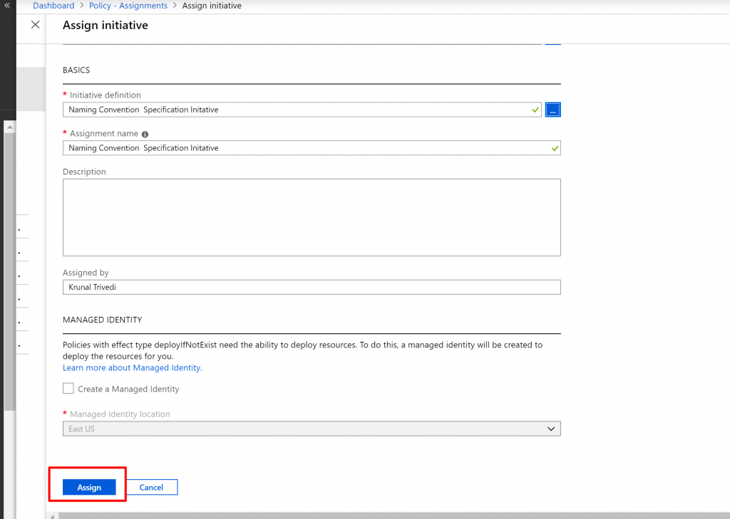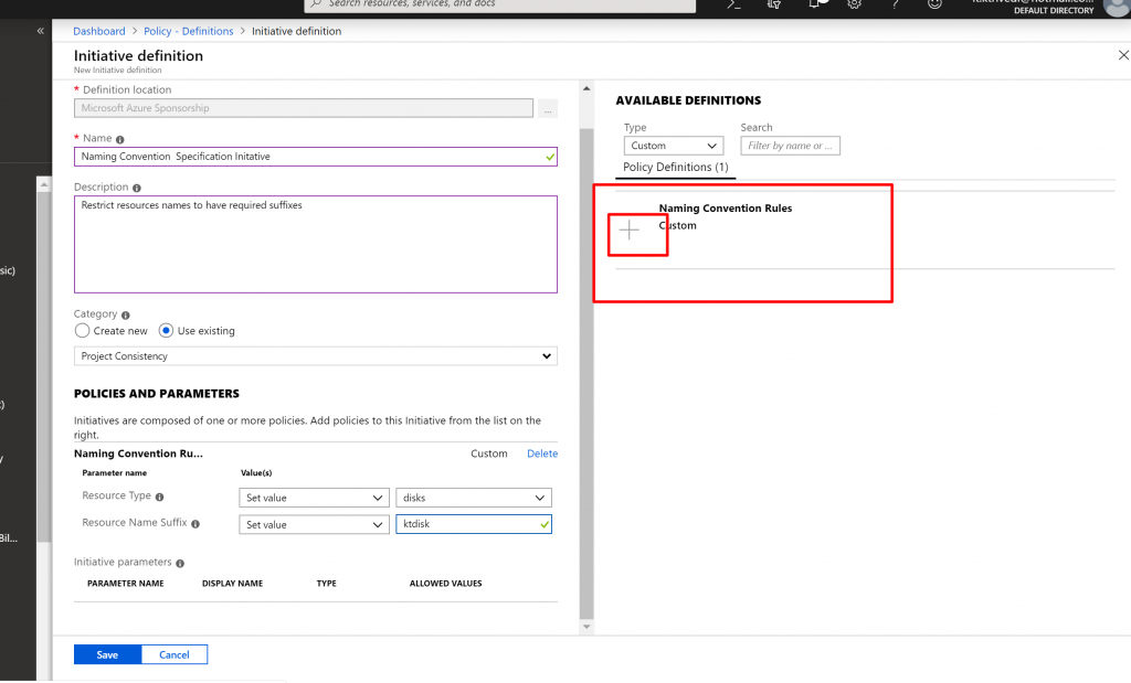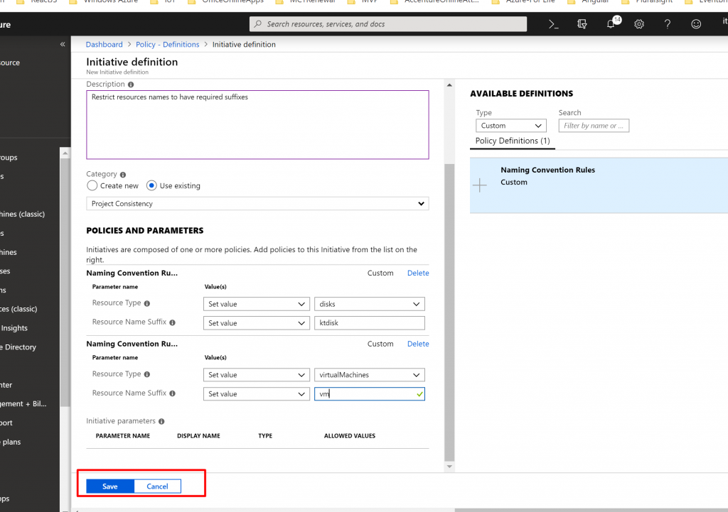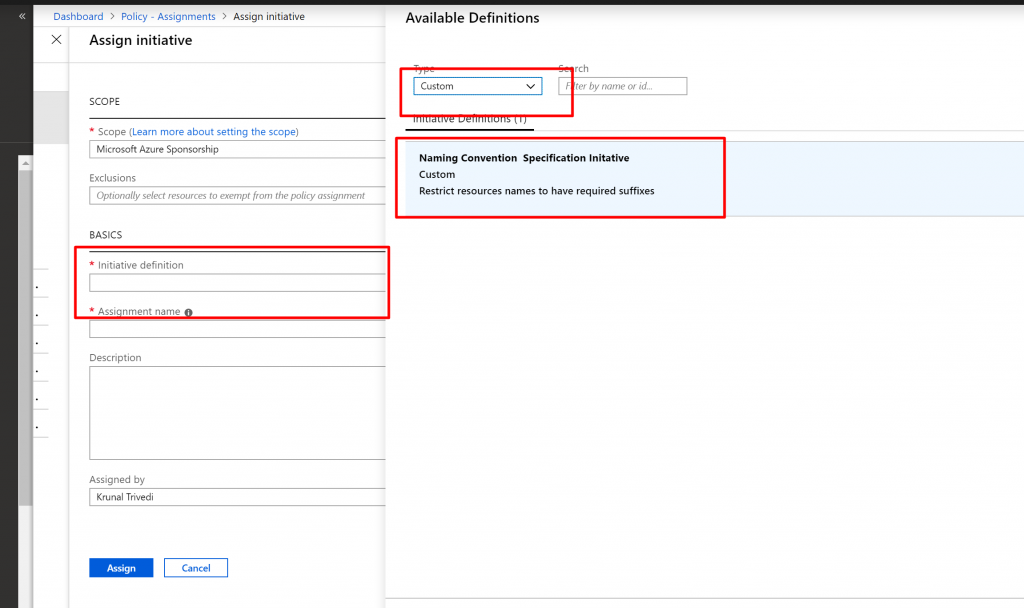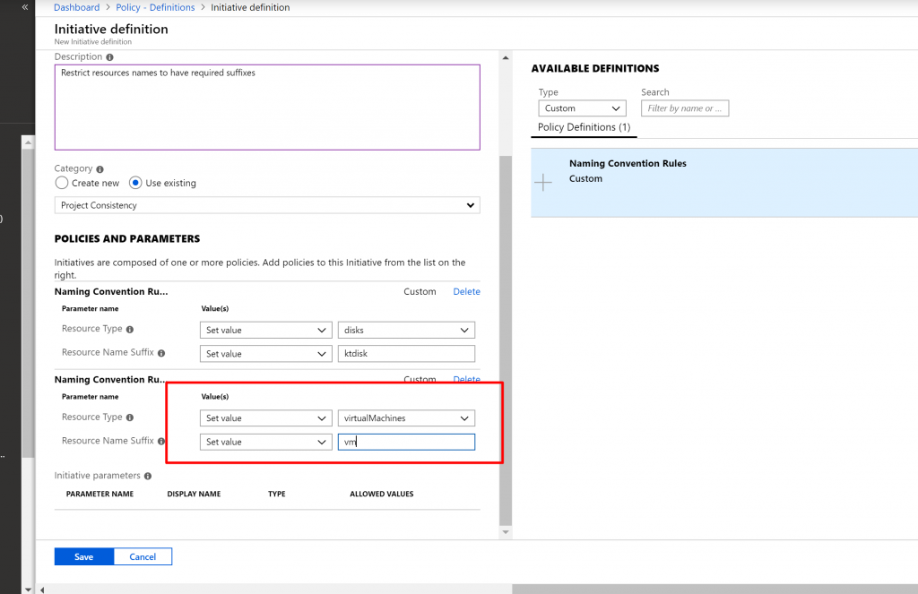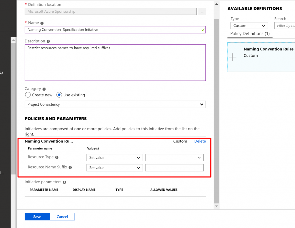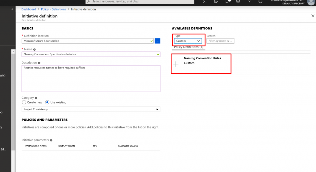 - In the Type dropdownlist we select Custom and select Naming Convention Policy Definition we just created.