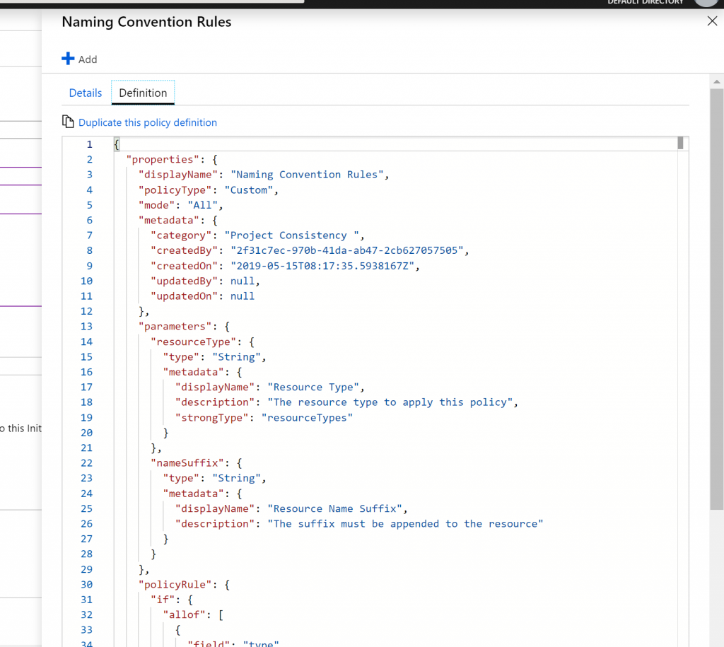 - Also once Naming Convention Rules is selected we can see the details of the Policy Definition along with the raw JSON.