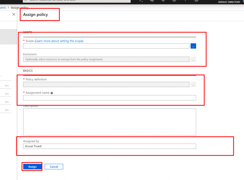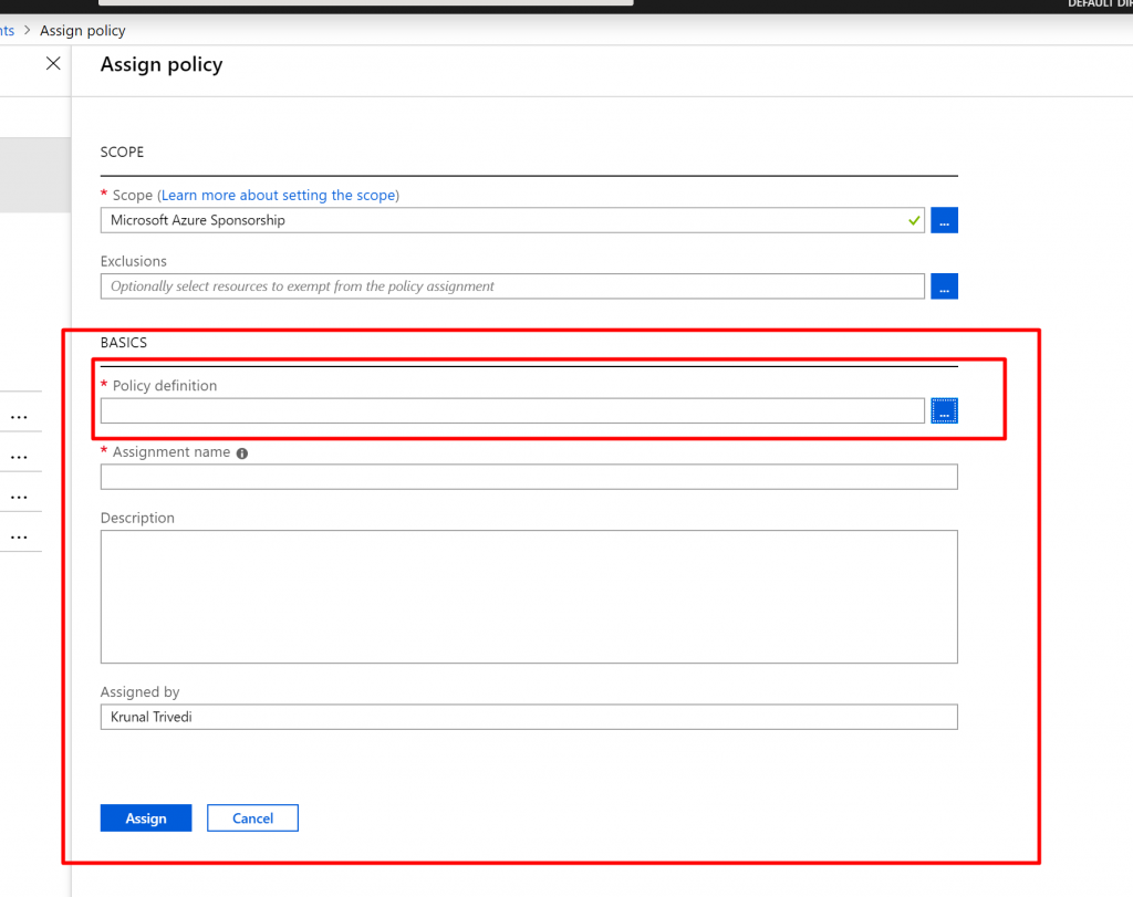 Here we have two sections. One is Scope where you can define the scope where the Policy would be applied. We can choose Management Group, Subscription or Resource Group. We can also define the exclusions here – where this policy would not be applied. Second section is BASICS. Here you select Policy Definition – what the policy does , Assignment Name and Description.