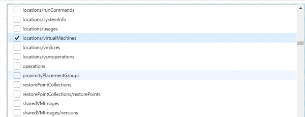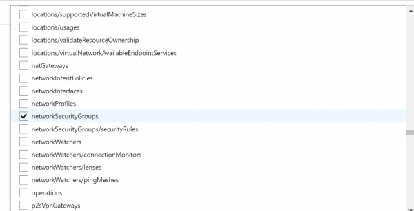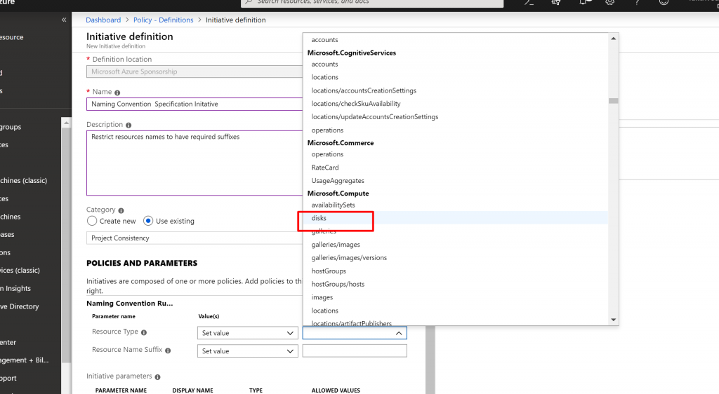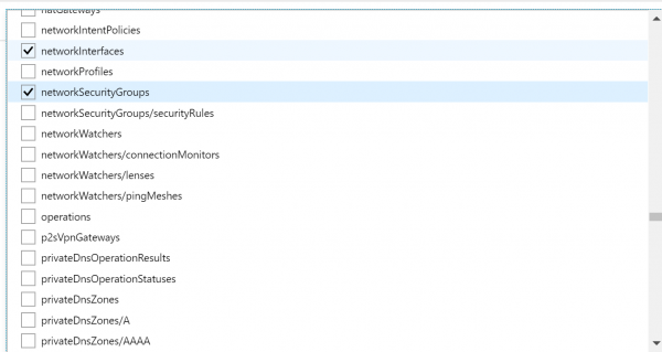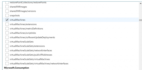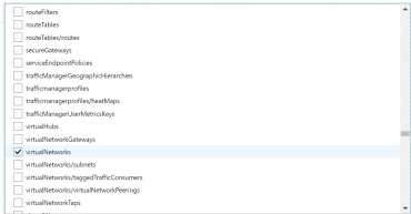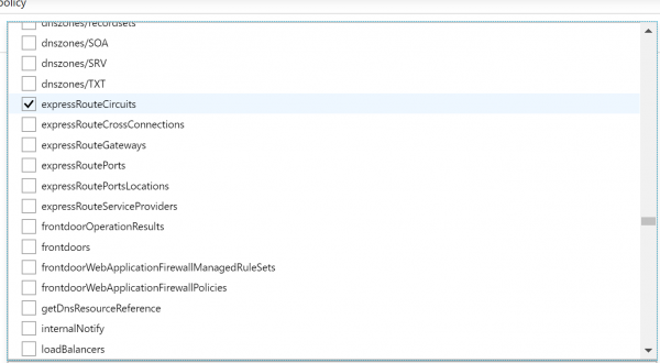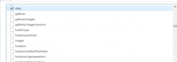 - Now we have to select which Resource types we want to allow. Click on the drop-down list. It is a long list of items, so it takes few moments to populate. Here we are going to select disks,virtual machines, network interfaces, network security groups, public IP addresses, express routes, virtual network.