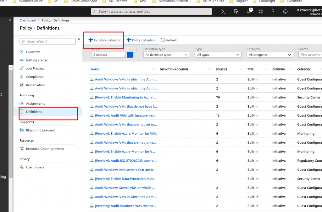 - But you may want to use Policy definition for multiple resource type. That’s why Initiative Definition is used for. Initiative Definition is used to group multiple Policy Definition together.