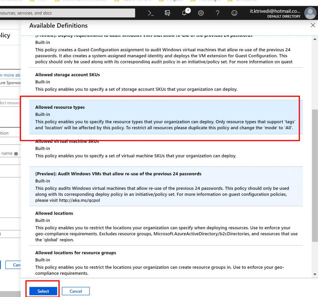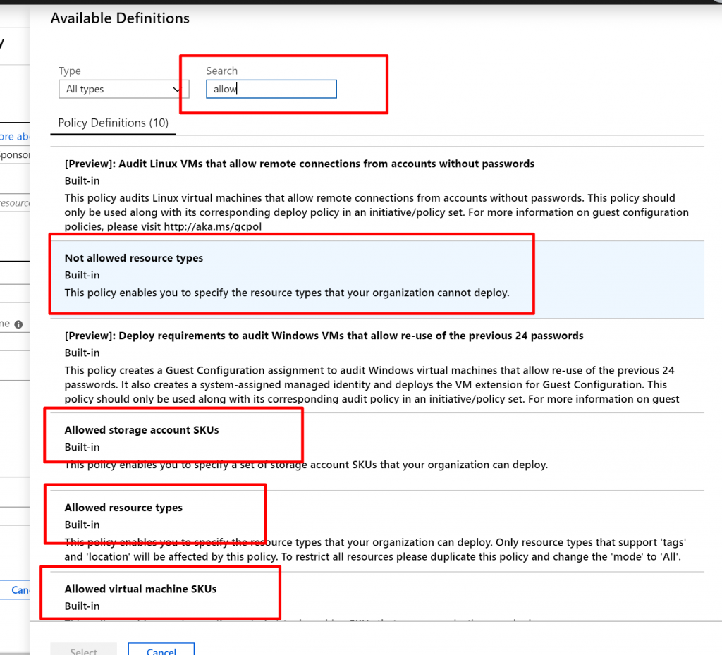 - You can see couple of Policies are available such as Allow resource types will allow only certain types of resources to be provisioned in the Subscription, Allow Virtual Machine SKUs will only allow certain SKUs of VM, Allow location will restrict the location where your organization can provision the resources within the subscription etc. Here we are going to select Allowed resource types.