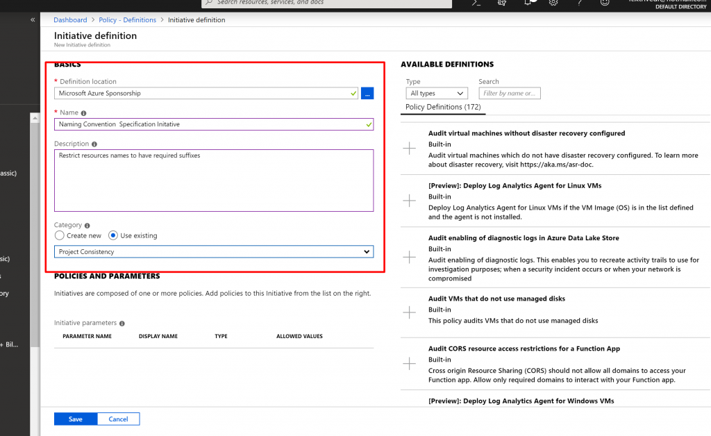 - Now from the right we have to select Policy Definitions we want to be a part of this Initiative Definition.