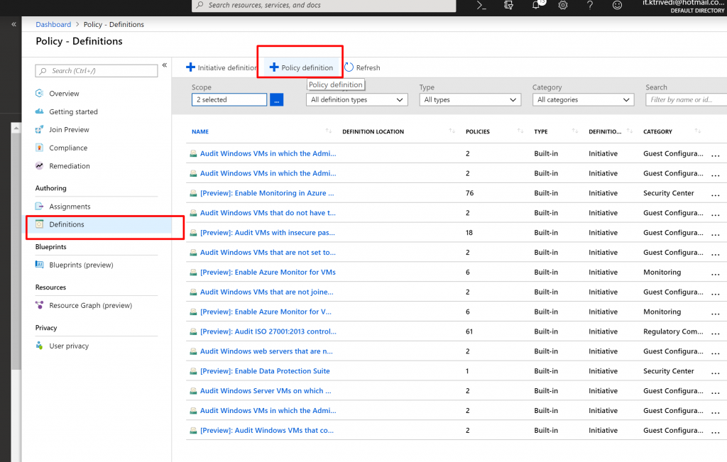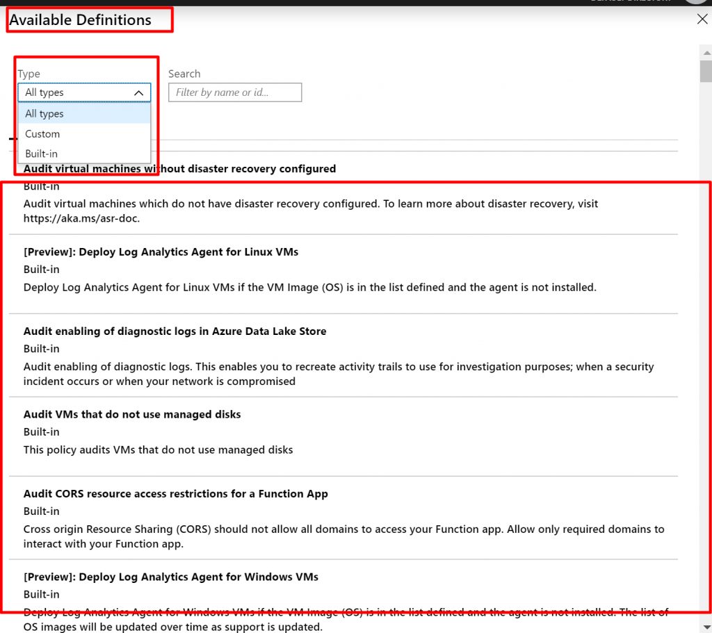 - Now click on dots next to Policy Definition. Here we can see all available Policy Definitions including both Built-In and Custom. There are more than 50 Built-in Policy definitions.