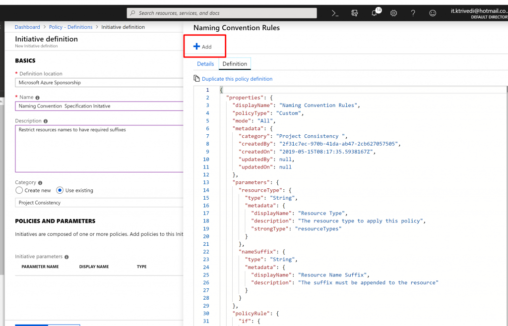 - Click on Add, to add the Policy Definition to the Initiative Definition.