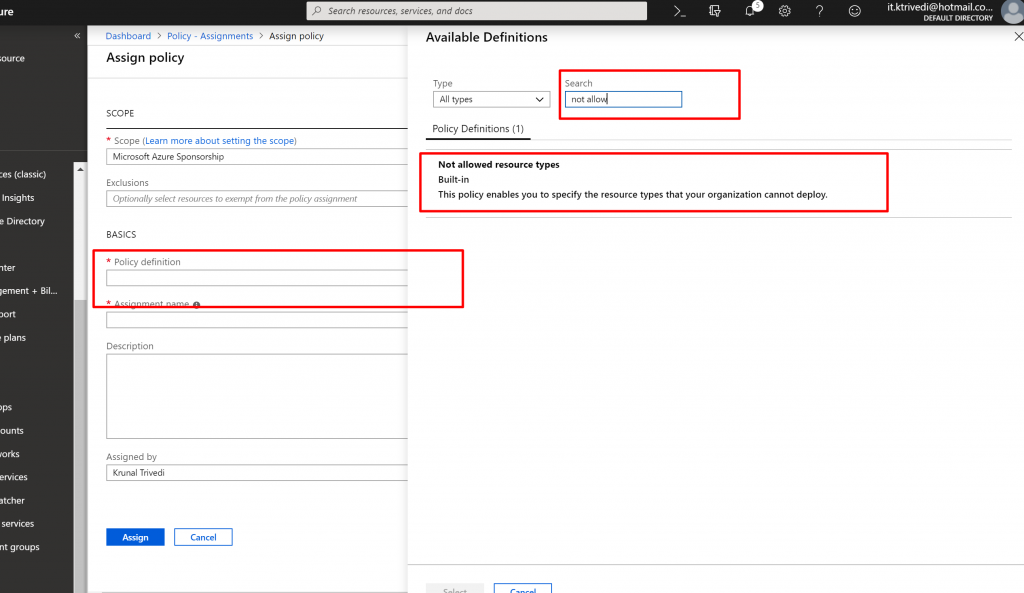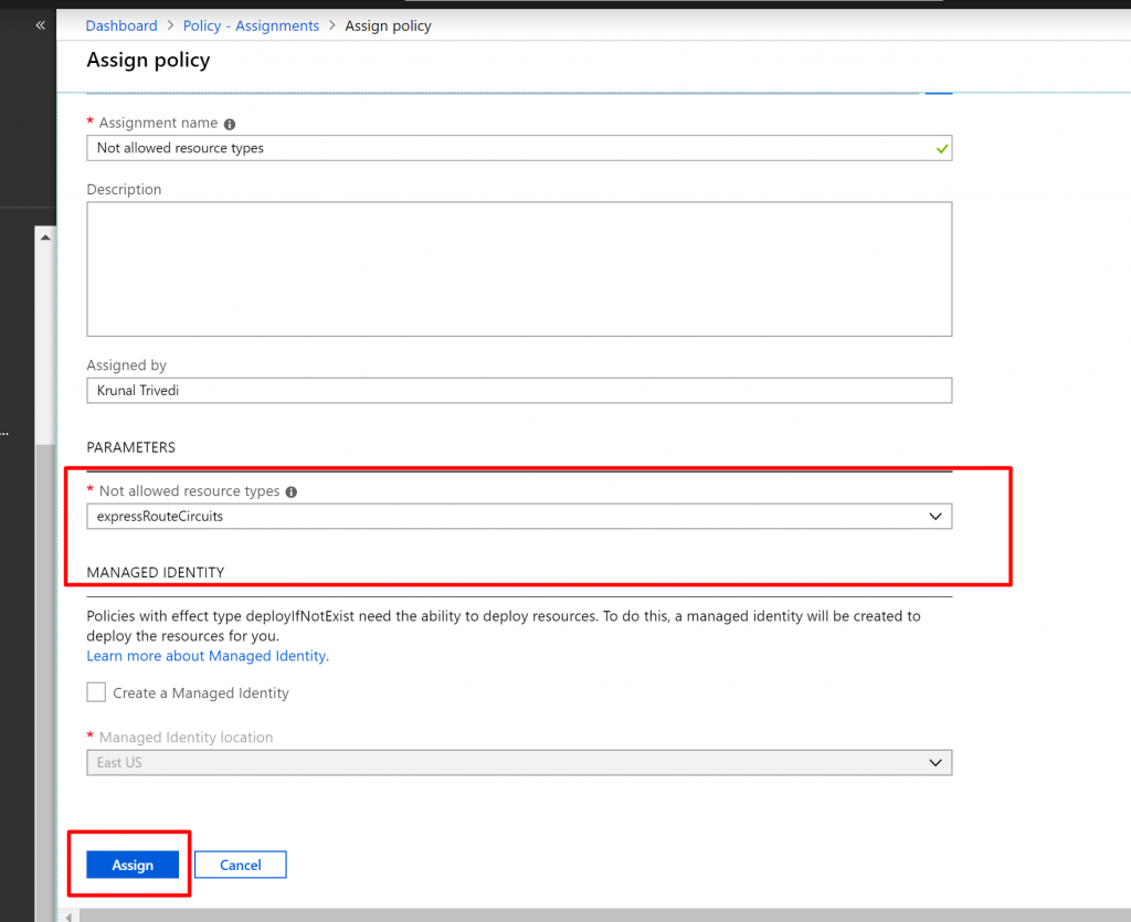 - But in this case , within a subscription there would be one group where I do want to allow ExpressRoutes. That’s how IT team managing ExpressRoutes can provision it. So click on the dots in the Exclusion drop-down list and select your ResourceGroup. And finally click on Assign. So here I select not-allowed resource types is expressroutes circuit but there is one group in the exclusion where I can create expressroutes.
