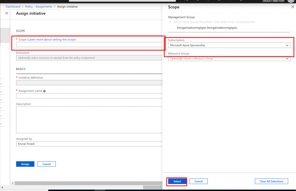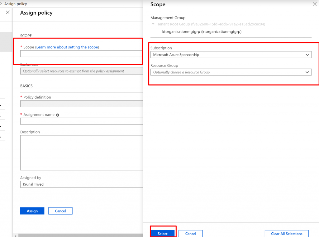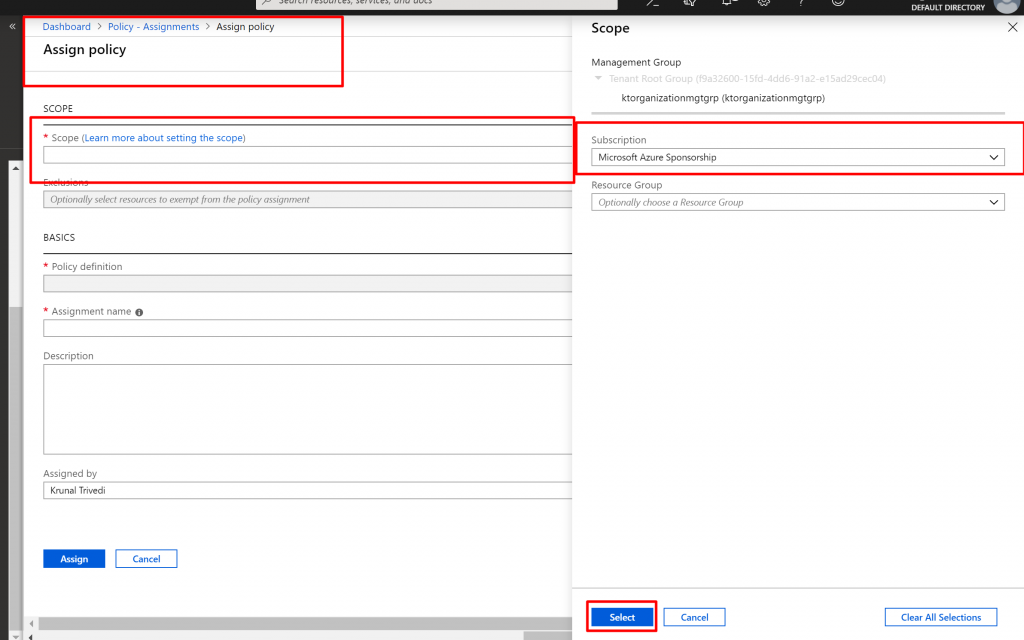 - Click on the dots next to Scope. Here I am going to select Subscription and not going to select any Resource Group. This means, Policy would be applied to all the Resource Groups in the Subscription level.