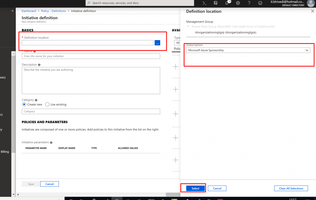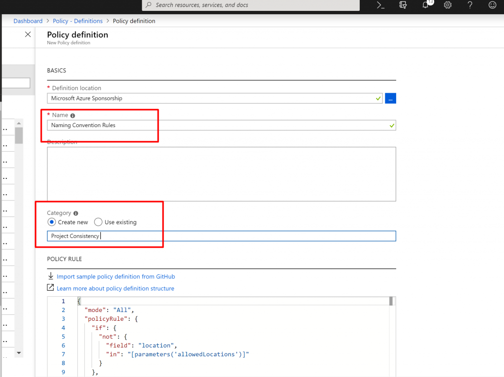 - Now, we provide name and, we can organize policy definitions into categories. We can use existing categories, or we can create the new one. Here I create the new custom category one.