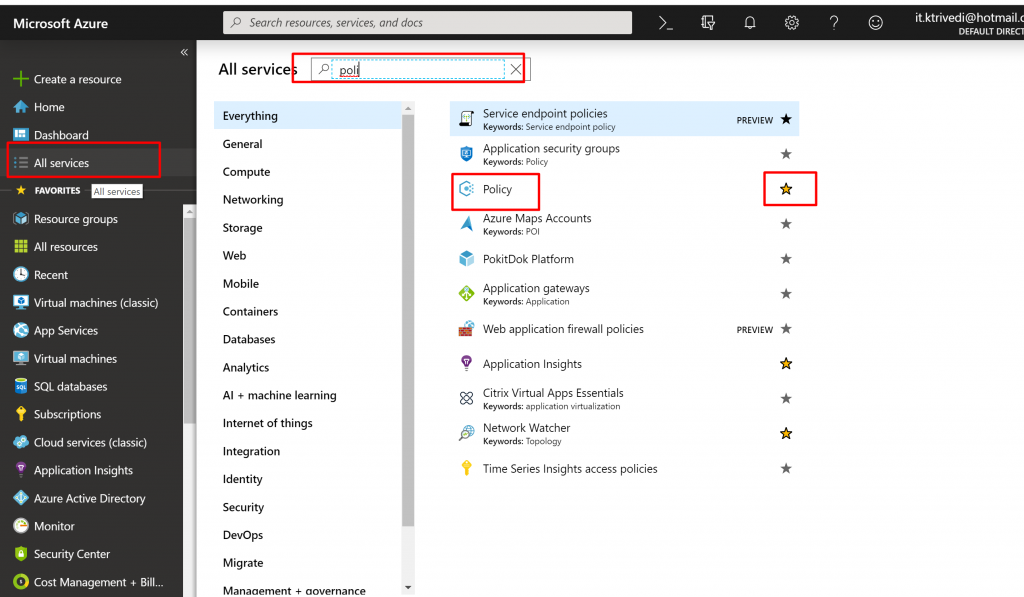 - Open Azure Portal. Click on All Services and Search for Policy. You can also click on star icon and set it as your favorite service to be displayed in the left side navigation menu.
