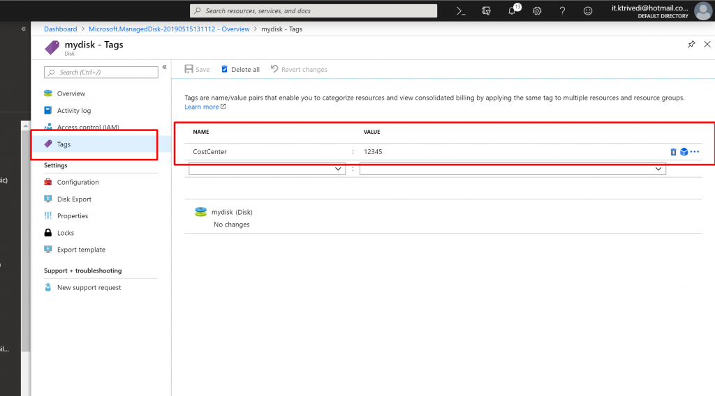 - Once the resource is created, if you go to the resource and click on Tags, you can see the Policy is applied and default Tag named CostCenter with the value 12345 is applied to the resource.