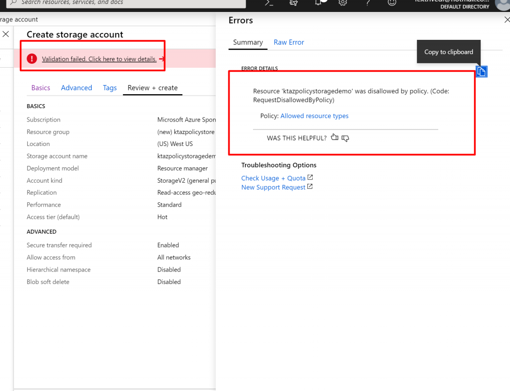 - When you try to create it you can see validation error and if you click on it, it will show policy violation. Disallowed by policy.