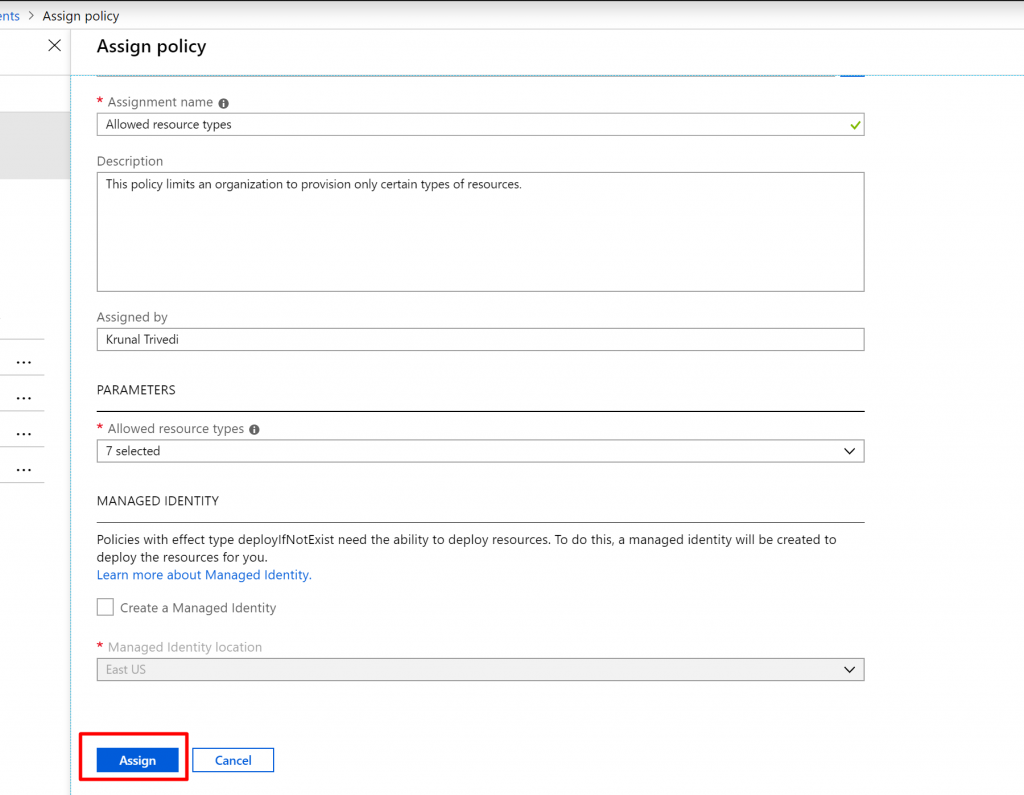 - Once you click on the Assign Policy you will get the screen as below.