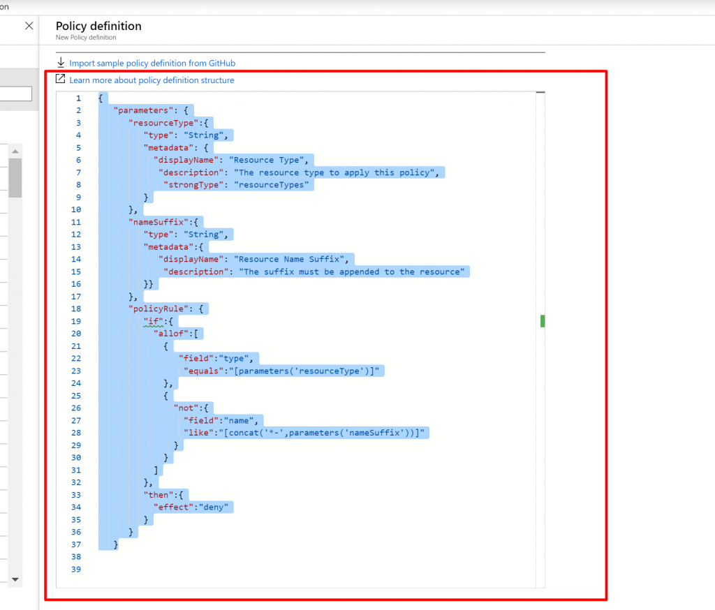 - Now, remove the existing Policy Definition – JSON structure and add the new one as shown below.
