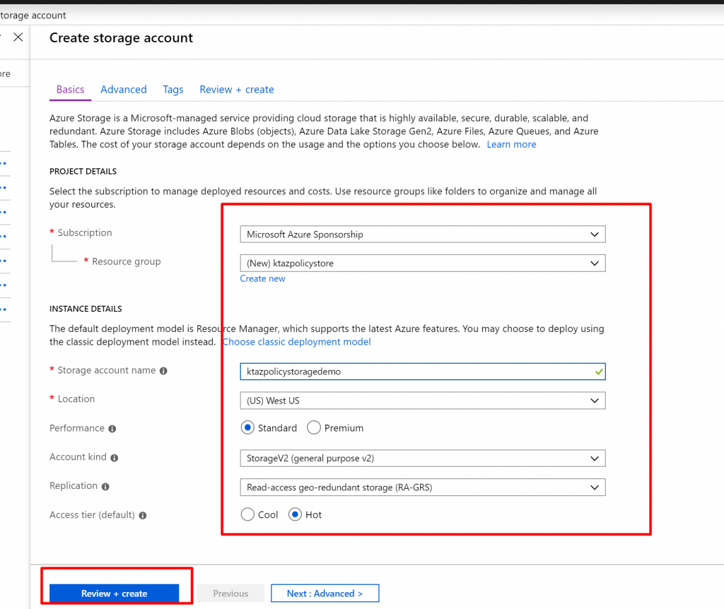 - We provide some random values and click on Review + Create.