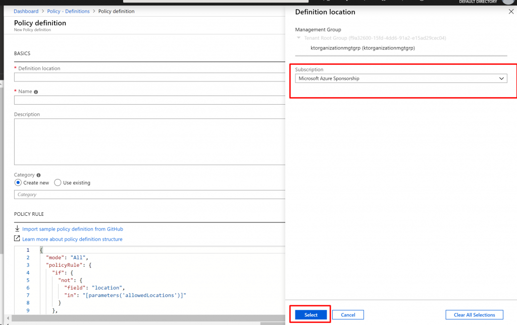 - Now, here first we select the location where our policy would be applied. We are going to select our subscription name.