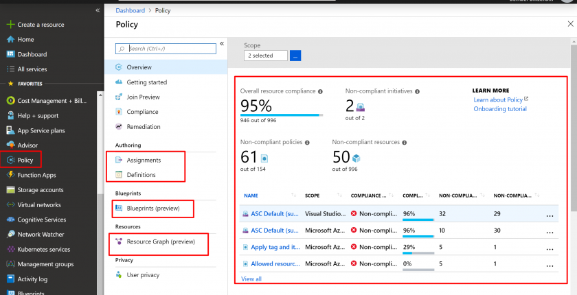 - Click on the Policy and you can see the policy dashboards. Also, you can see Policy Definitions, Policy assignments, Blueprints and Resource Graph.