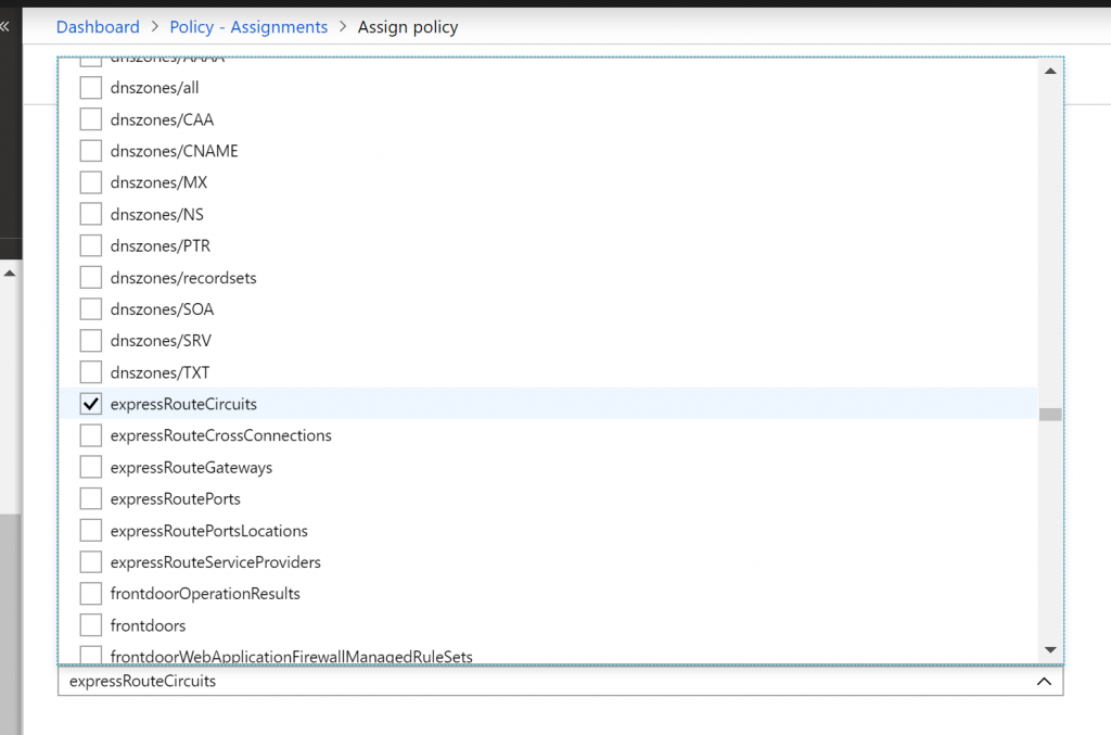 - Now, let us create another assignment. Click on Assign Policy. This time select not-allowed resource types. Here we are going to select expressroutescircuit resource. . ExpressRoutes are expensive so this is the way how can we limit it.
