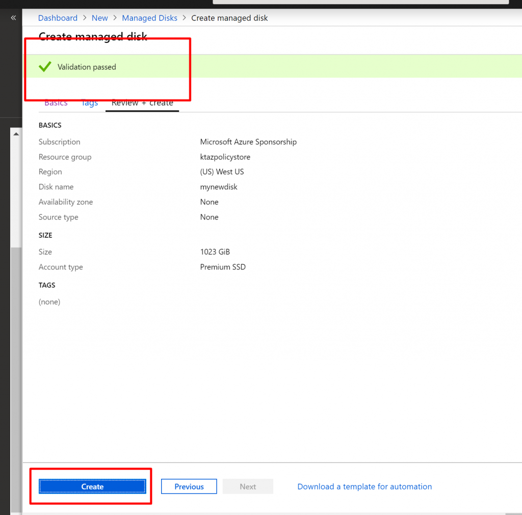 - You can see it has passed the validation and click on Create.