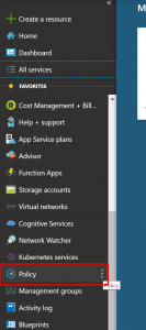 - Open Azure Portal. Click on All Services and Search for Policy. You can also click on star icon and set it as your favorite service to be displayed in the left side navigation menu.