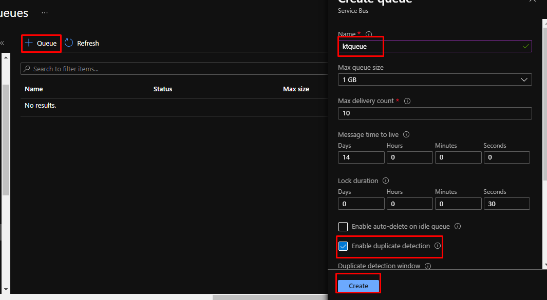 Since there won’t be any queue present in the namespace, create a new queue. Give it a name and enable duplicate detection. Click create.